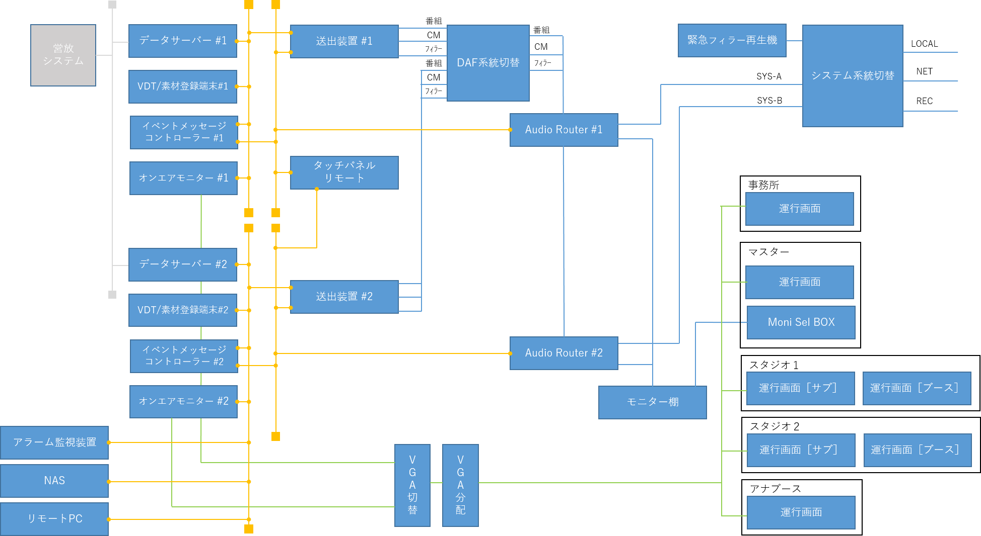 - APSからの指示に従って番組/CM/フィラー送出を行います。(アナログ、デジタル各1系統ずつ)